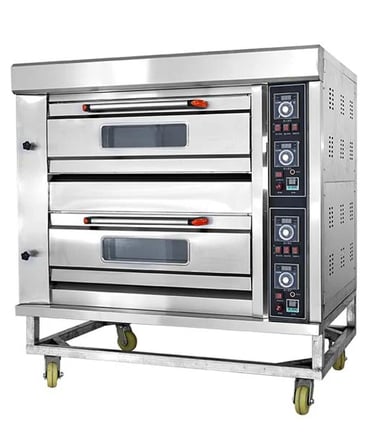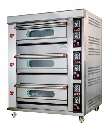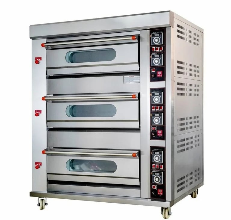 Heavy-duty 3-deck Gas Baking Oven with stainless steel body, digital temperature control, and glass view windows.